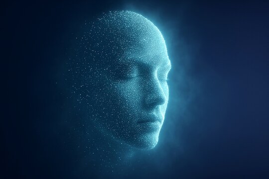 Glowing blue human brain hologram floating in dark space with digital particles and connections