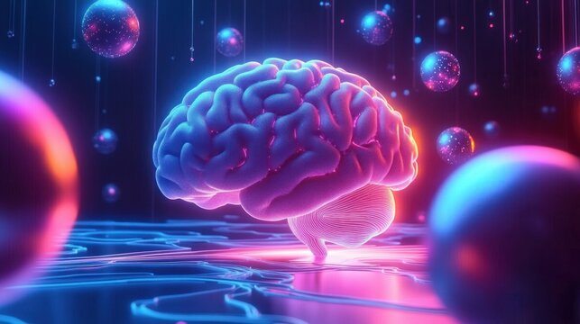 Glowing futuristic brain model surrounded by illuminated floating spheres in a neon-lit digital environment