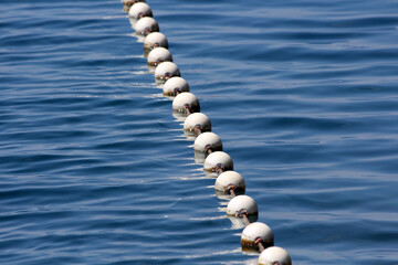 Series of round white buoys connected by rope form a straight line across calm blue water, marking a boundary or swimming area in a lake or sea under clear sky