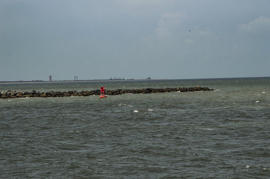 Aerial view of a floating platform adorned with buoys and debris, reflecting the stark beauty and environmental concerns of Gloucester harbor, Gloucester, Massachusetts, United States.