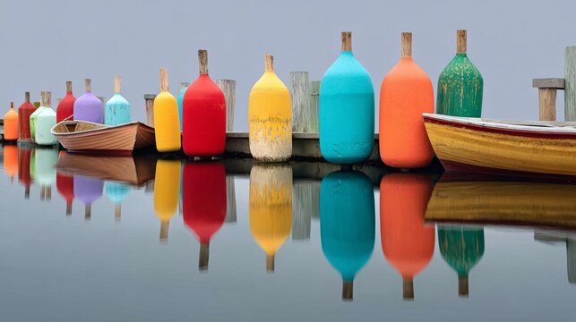 Row of colorful buoys are floating in the water. The buoys are in various colors, including red, yellow, and blue. The scene is peaceful and serene, with the buoys reflecting the surrounding water