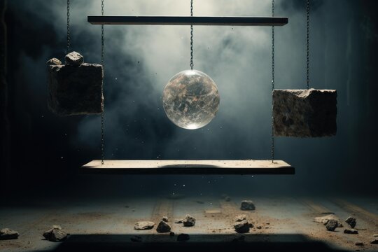 Abstract balance scale with geometric elements and floating spheres