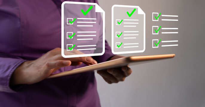 Digital checkmark interface with user hand tapping tablet screen surrounded by floating approved checklist icons on light blue background.
