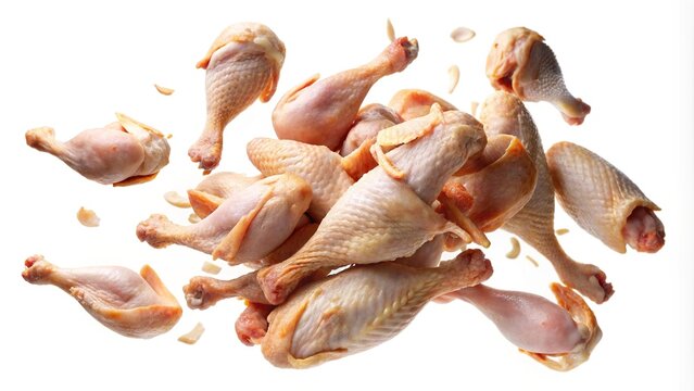 Floating raw chicken drumsticks with garlic slices isolated on a white background