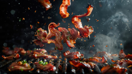 Grilling assorted sausages, chicken, and pork steaks with smoky char marks