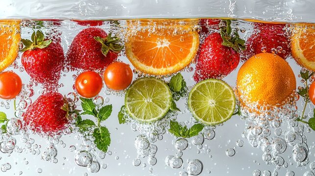 Slices of citrus fruits, strawberries, and mint leaves floating in clear water with bubbles, creating a refreshing summer aesthetic.