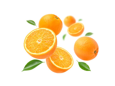 Orange with cut in half and leaves levitate isolated on white background.