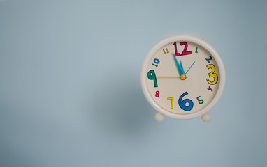 Kids clock floating in light blue background with copy space.