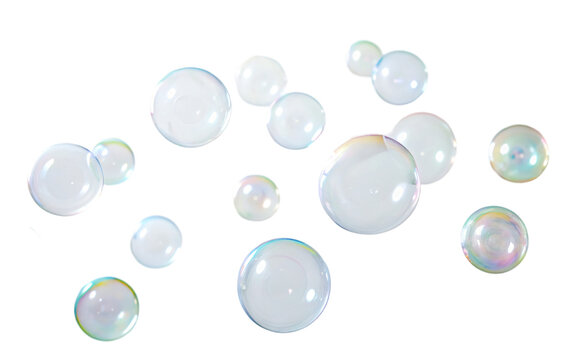 Gentle hand holds a cluster of white foam with iridescent bubbles floating around, illuminated by soft, natural sunlight, symbolizing purity and cleanliness on a serene blue backdrop