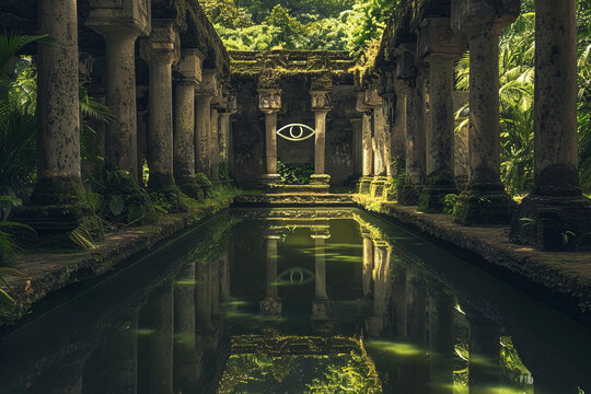 Underwater ancient ruins with classical columns surrounded by floating jellyfish and marine vegetation.
