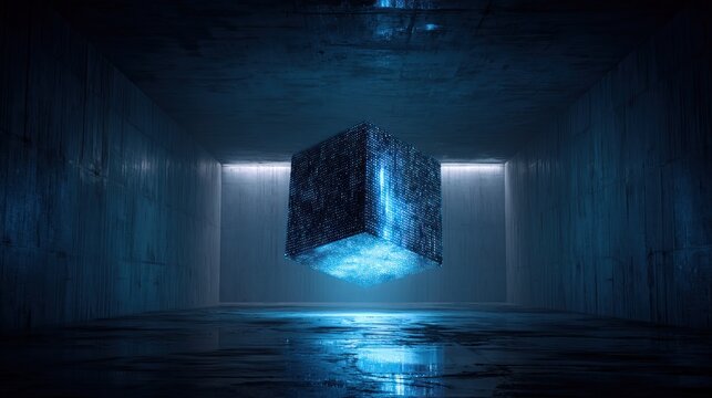 A floating, metallic cube with blue and green glowing lights inside, suspended in a dark, industrial setting with concrete walls and reflective surfaces.