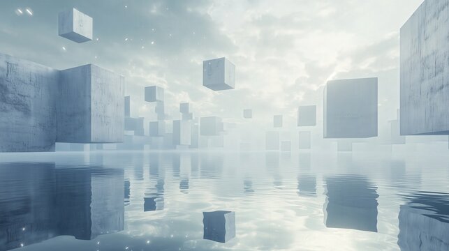 Surreal floating concrete cubes hover over a reflective, calm water surface under a cloudy sky.