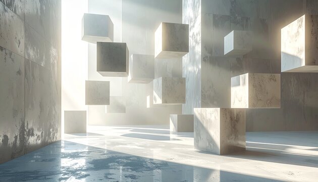 Abstract concrete cubes floating in a modern geometric space