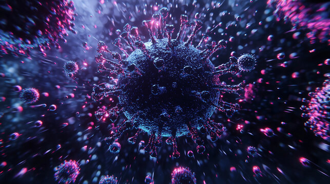 A reasonable background of purple and blue tones, an abstract composition of coronavirus cells, macro photography,