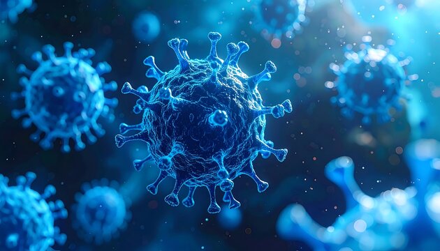 Microscopic view of blue viruses floating on a soft gradient background, with ample copy space for text, perfect for medical or scientific themes.