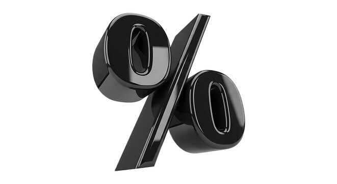 A glossy black percentage sign floating against a stark black background in a studio setting