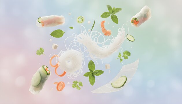 Vibrant deconstructed falafel wrap with colorful vegetables and floating elements creates dynamic and appetizing scene. wrap includes falafel balls, radishes, cucumbers, and lettuce