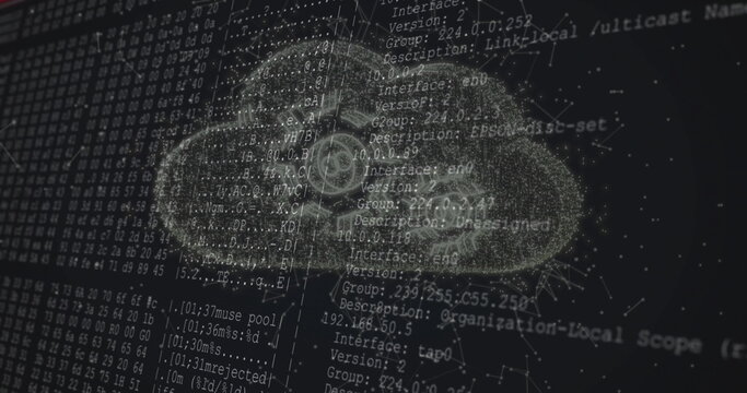 Displaying stylized cloud network over code matrix, showing nodes and lines with overlaid code text