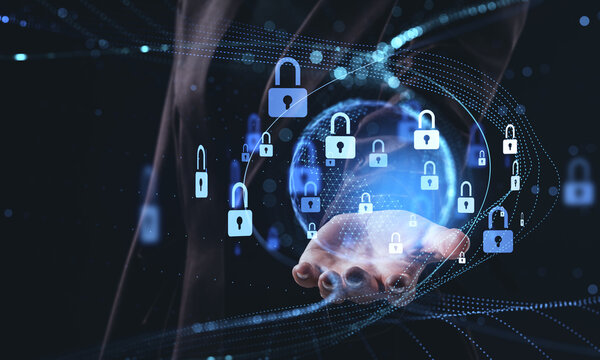 Cybersecurity concept with floating hologram padlocks above a human palm, symbolizing data protection and digital security technology network globe.