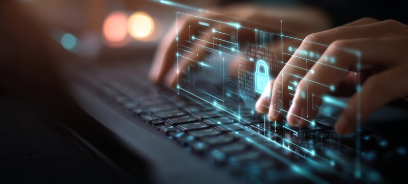 A person typing on their laptop with an illuminated padlock icon floating above the keyboard, surrounded by digital code and cyber security symbols.