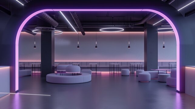 A lounge with neon signage accents, industrial piping details, and holographic displays floating above a low-slung seating area