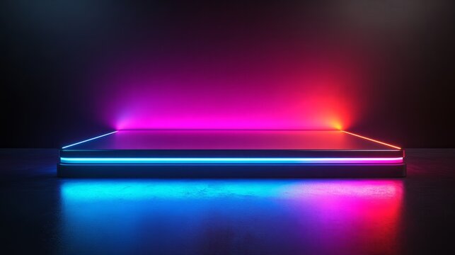A glowing podium with high-tech features, floating panels, and vibrant digital displays