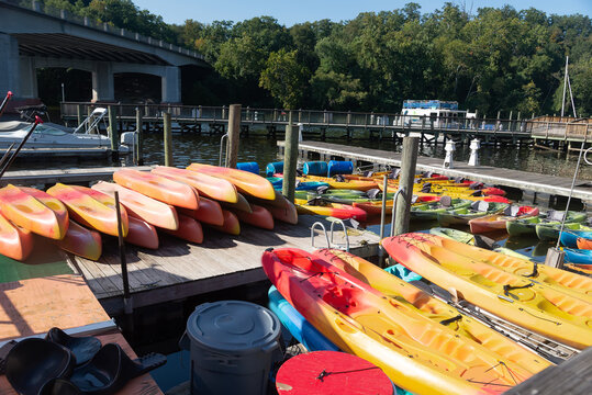 Colorful plastic kayaks ready for outdoor adventure at coastal harbor