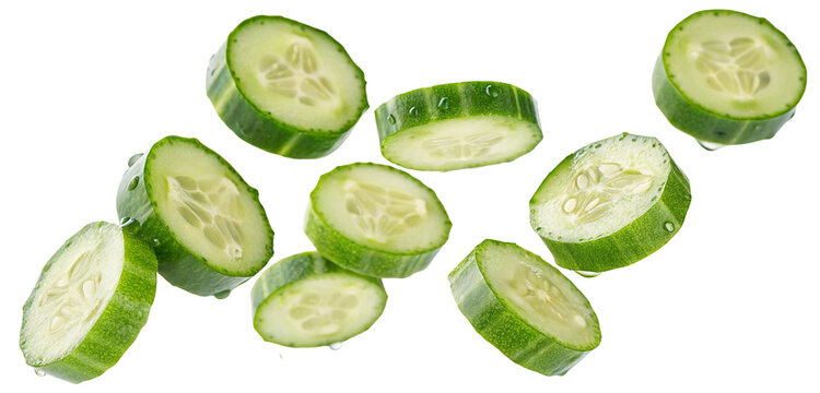 A strawberry and a banana with water droplets floating in mid-air against a white background.