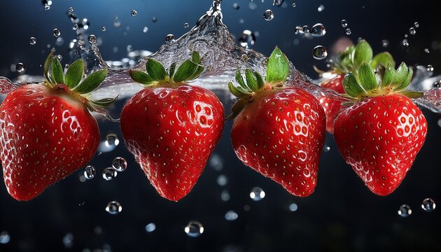 a dynamic scene of ripe strawberries floating with water droplets capturing freshness