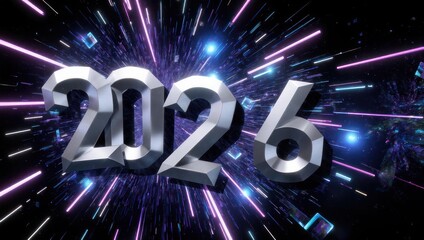 Silver "2026" emerges from a cosmic burst with light streaks and floating cubes