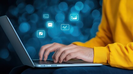 Person typing on laptop with email icons floating around indicating communication and notifications online