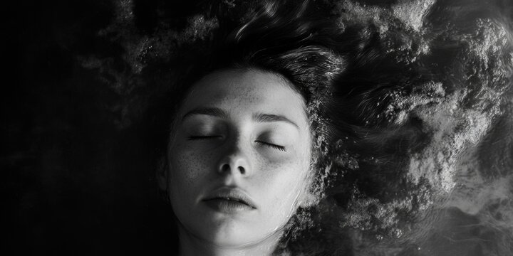 Young woman with eyes closed, floating face down in deep water. Sleepy expression, with bubbles around her head suggesting she is dreaming.