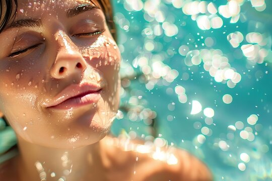 Teen girl floating on back in turquoise pool during sunny day, tranquil minimalist summer
