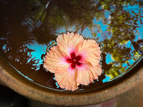 Brightly colored flowers with rich pink, orange, and yellow petals floating on a clear blue pool, their reflection mirrored perfectly on the waters surface, creating a peaceful, dreamlike atmosphere.
