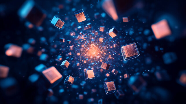 A holographic spiral of floating data cubes glows with digital light, forming a futuristic abstract scene. It symbolizes information flow, technology, innovation, and the dynamic pulse of modern data