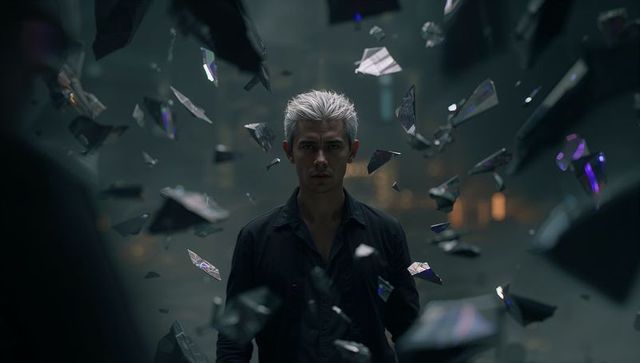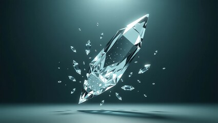 design with light swirls, broken symmetry, and floating glass-like fragments
