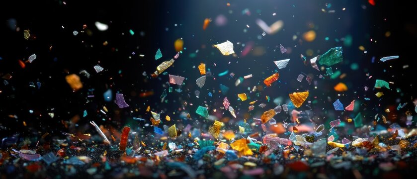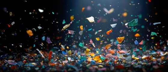 Microplastics floating in water, close-up view capturing their colorful appearance and translucency, environmental awareness theme