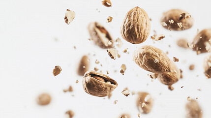 Sliced strawberries suspended in mid air against a white backdrop Strawberry fragments floating