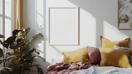 A 3D rendered minimalist mockup of a floating white frame displayed in a bright airy Scandinavian inspired bedroom with color textiles and modern clean decor elements