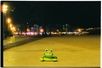 Floating retro instant camera printing sunset print in neon vaporwave tunnel