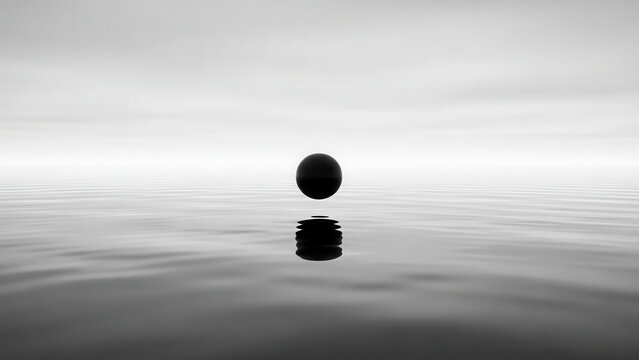 Minimalist black sphere floating above calm reflective water in abstract scene