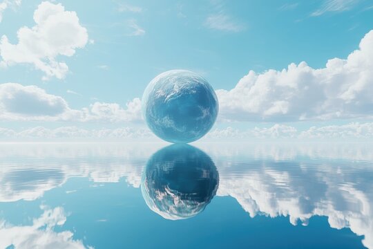 A 3D Model of the Earth with a Glowing Sunlight Effect Floating on the Ocean Waves