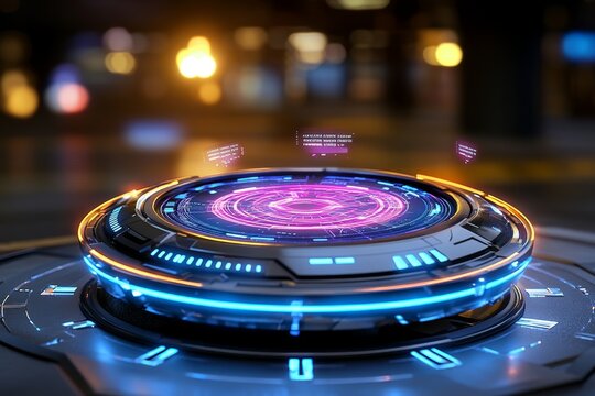 Futuristic high-tech control center with floating digital displays and data visualizations