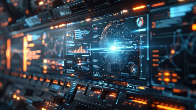 an advanced display screen with various data and icons floating above it : Generative AI