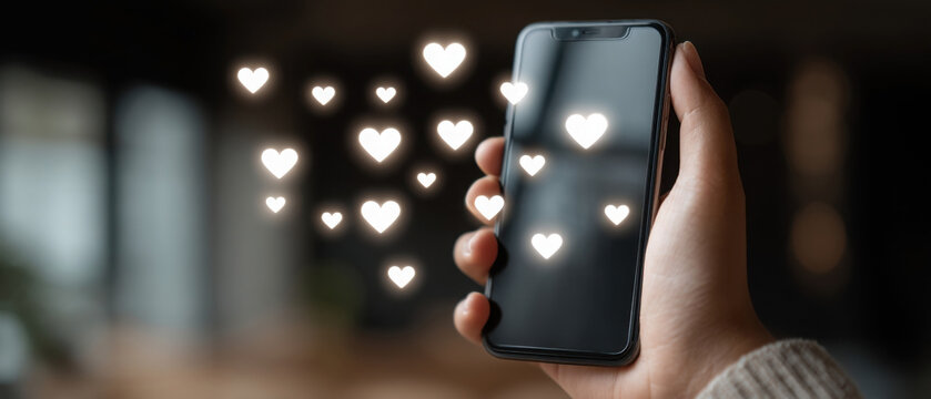 Close-up of a hand holding a smartphone with heart icons floating like on social media. concept social addiction, like, popularity
