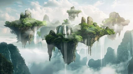 Fantastical floating rock islands amidst a sea of clouds, lush greenery, cascading waterfalls, a connecting bridge, and a vibrant sunrise or sunset sky with orange, pink, purple, and blue hues.