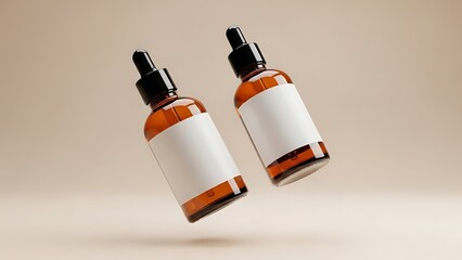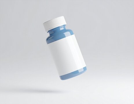 Generated image floating Pharma Bottle Mockup Minimalist blue glass bottle with white cap and blank label floating over a clean gray backdrop—ideal for supplements, wellness products.