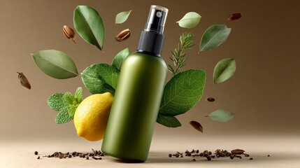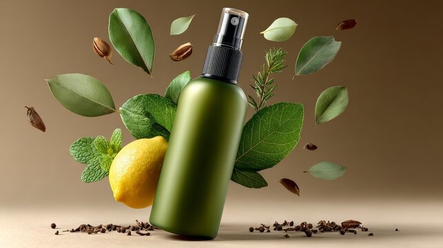 Green hydrosol spray bottle with no label surrounded by floating bay leaves, chamomile, eucalyptus, lavender, cloves, lemon, and mint against a warm studio backdrop with copy space