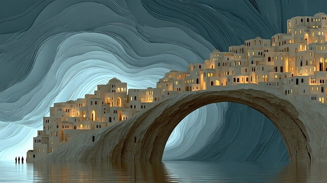 Surreal abstract background architecture lines bending gravity floating islands dreamlike fantasy landscape