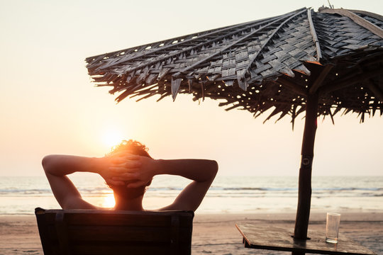 the man is resting on a sun lounger overlooking the sea and the sunset on the beach